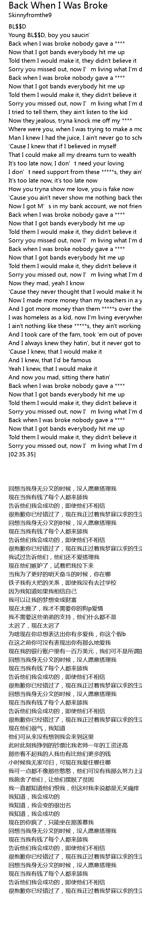 | [00:23.02] | Back when I was broke nobody gave a **** |