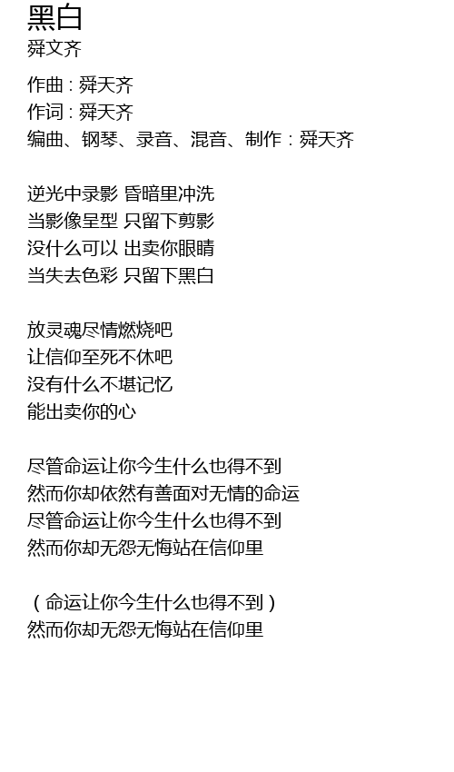 | 编曲、钢琴、录音、混音、制作:舜天齐 | |