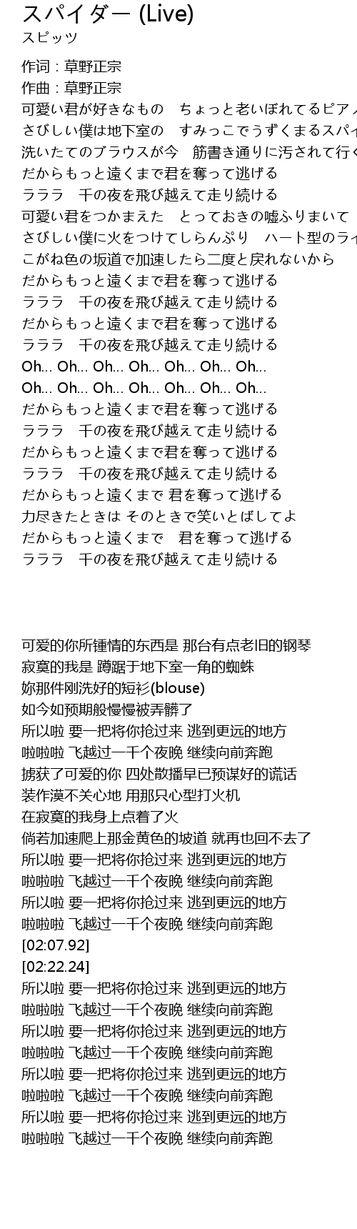 | [00:22.30] | さびしい僕は地下室の すみっこでうずくまるスパイダー |