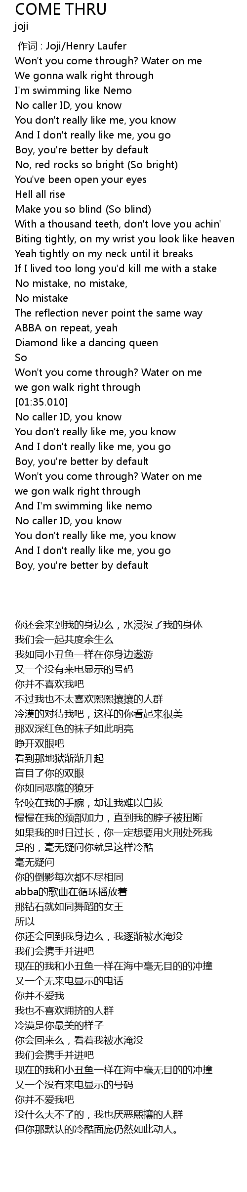 | [00:23.430] | Won' t you come through? Water on me |
