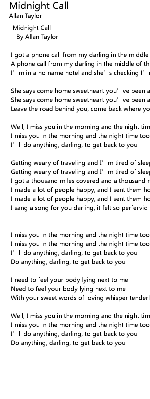 | Getting weary of traveling and I’m tired of sleeping alone | |