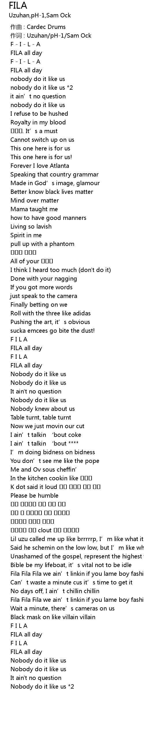 | [02:31.065] | Fila Fila Fila we ain’t linkin if you lame boy fashion killa killa |