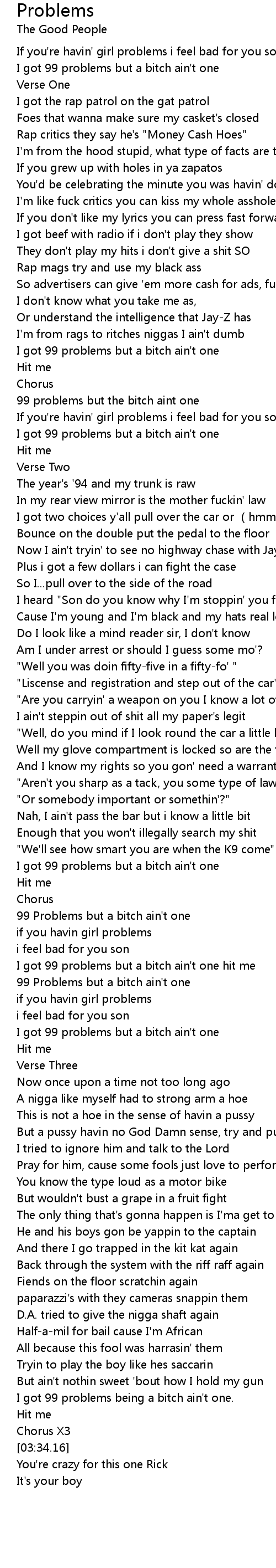 | [01:57.72] | 99 Problems but a bitch ain' t one |