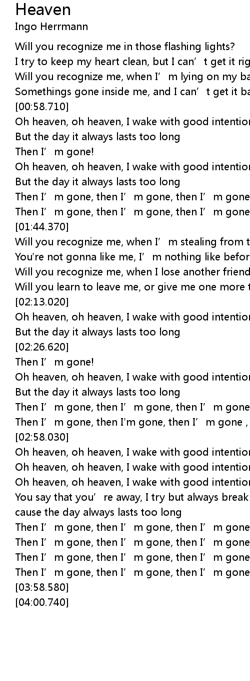 | [02:59.120] | Oh heaven, oh heaven, I wake with good intentions, |