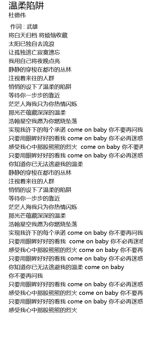 | [03:22.000] | nǐ zhī dào nǐ yǐ wú fǎ táo bì wǒ de wēn róu come on baby nǐ bú yào zài wèn wǒ |