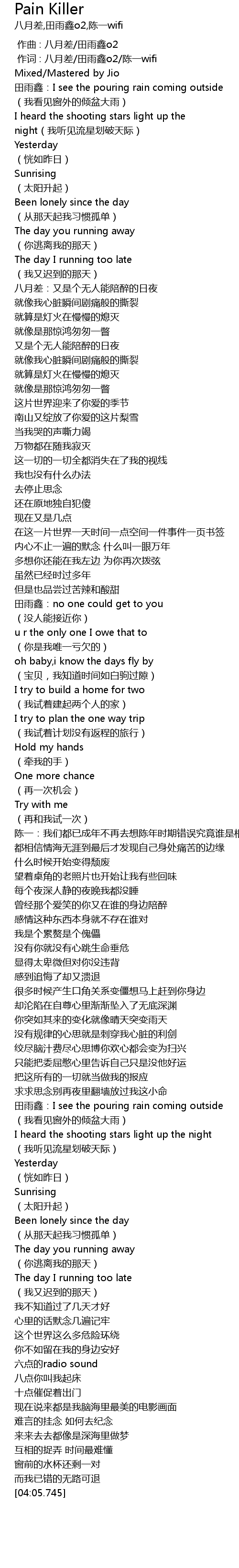 | [00:01.000] | 作词 : 八月差/田雨鑫o2/陈一wifi |