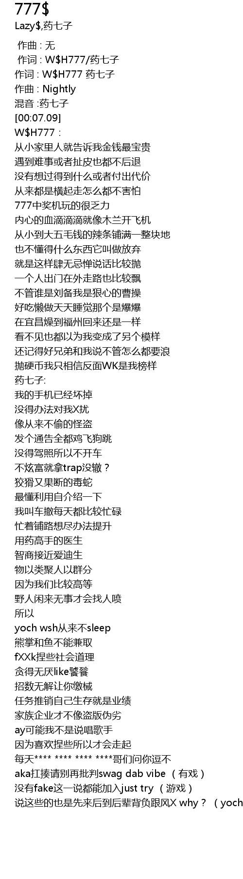| [00:03.04] | 作词 : W$H777 药七子 |