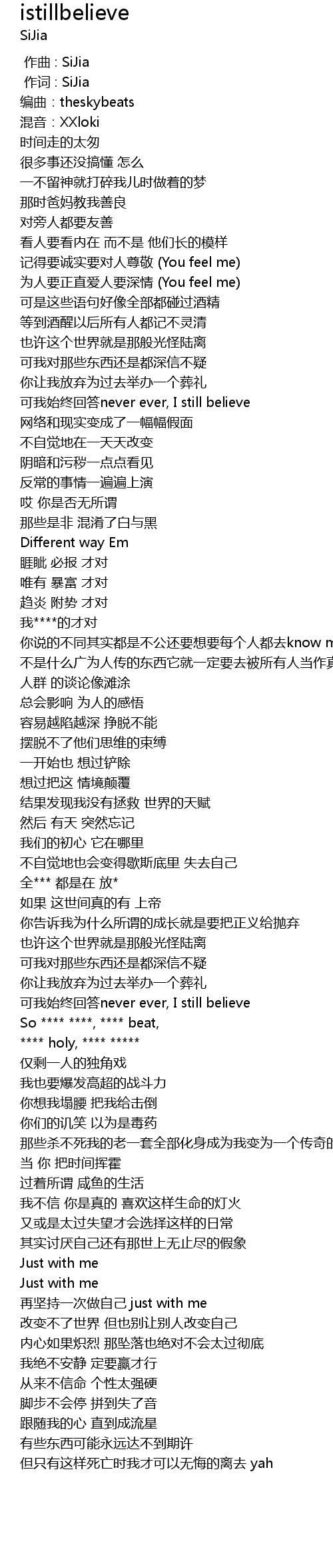 | [01:51.504] | kě wǒ shǐ zhōng huí dá never ever, I still believe |