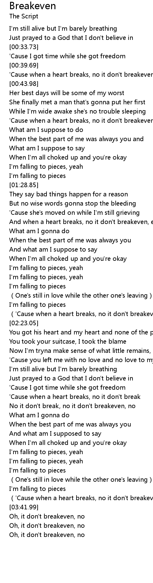 | [03:37.71] | ('Cause when a heart breaks, no it don't breakeven) |