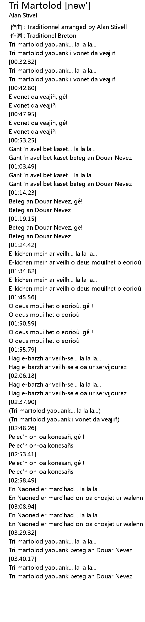 | [03:29.82] | Tri martolod yaouank... la la la... |