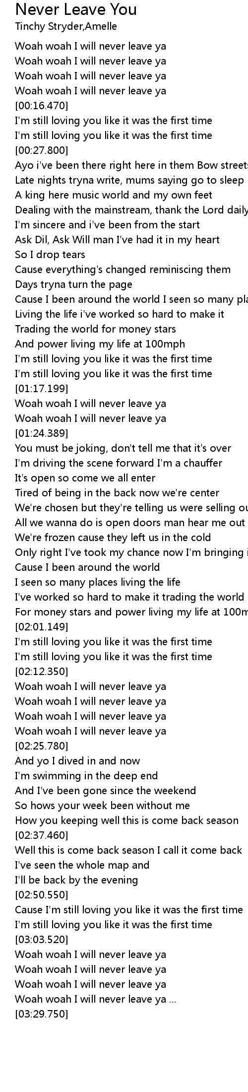 | [03:04.490] | Woah woah I will never leave ya |