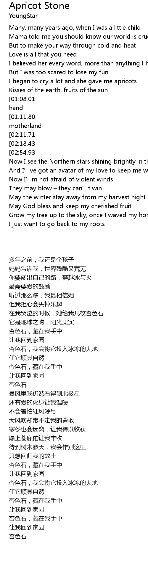 | [00:58.28][02:11.71] | Apricot stone, I will drop it down in the frozen ground |