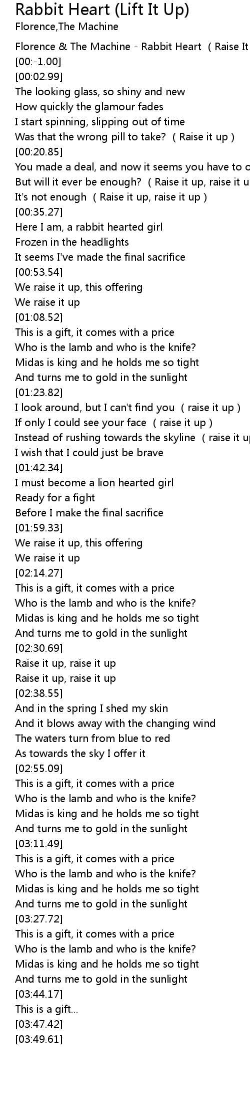 | [00:-2.00] | Florence The Machine Rabbit Heart Raise It Up |
