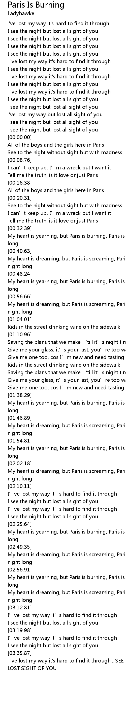 | [03:05.51] | My heart is dreaming, but Paris is screaming, Paris is screaming all night long |