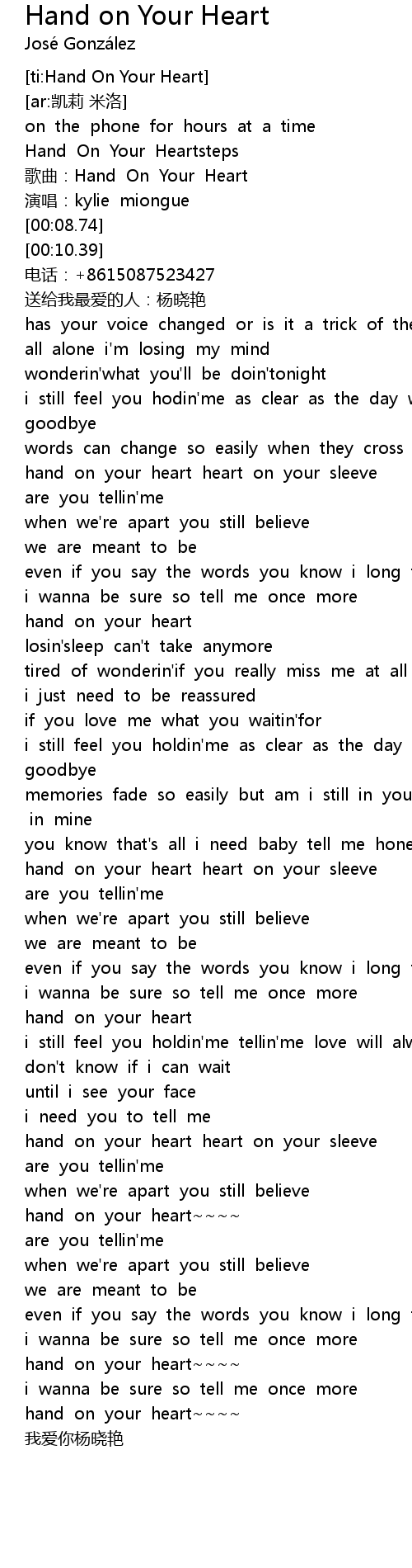 | [00:05.82] | 歌曲:Hand On Your Heart |
