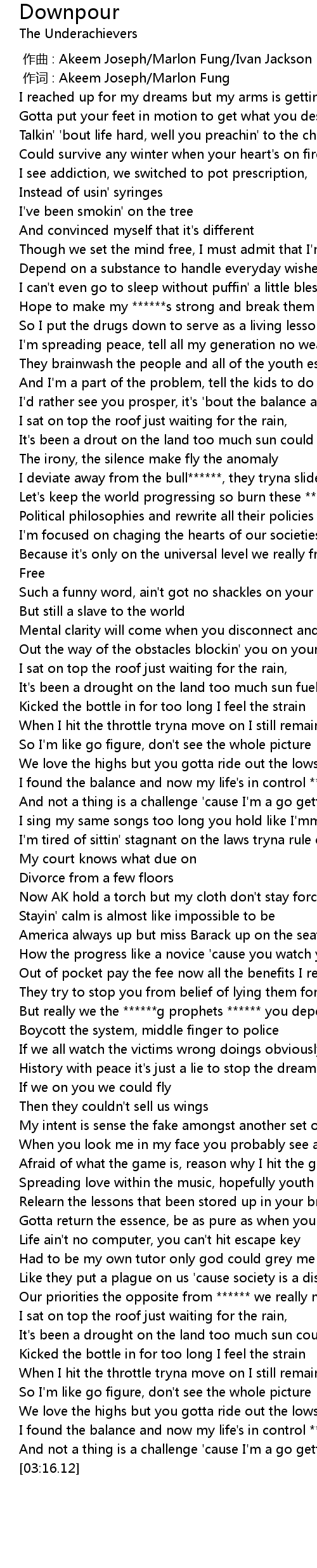 | [00:37.86] | Hope to make my ******s strong and break them out of depression |