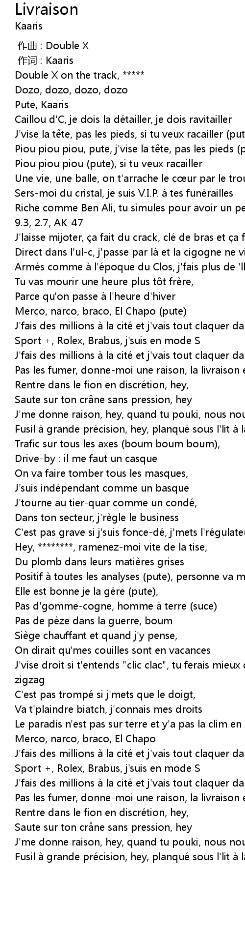 | [00:16.89] | J' vise la t te, pas les pieds, si tu veux racailler pute |