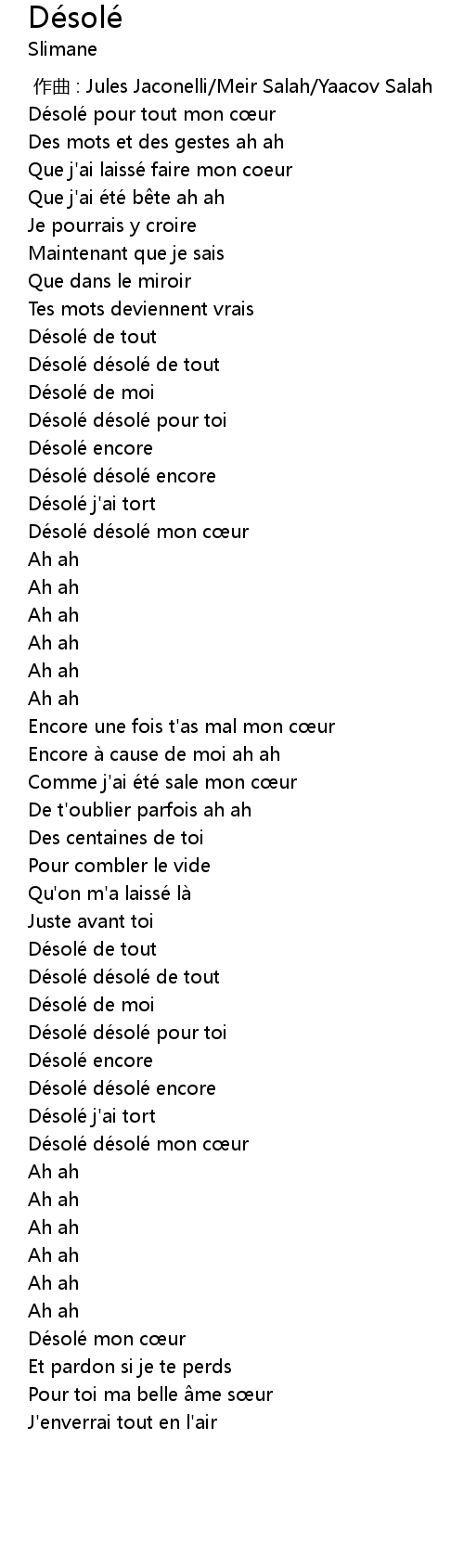 | [02:03.16] | Dé solé dé solé pour toi |