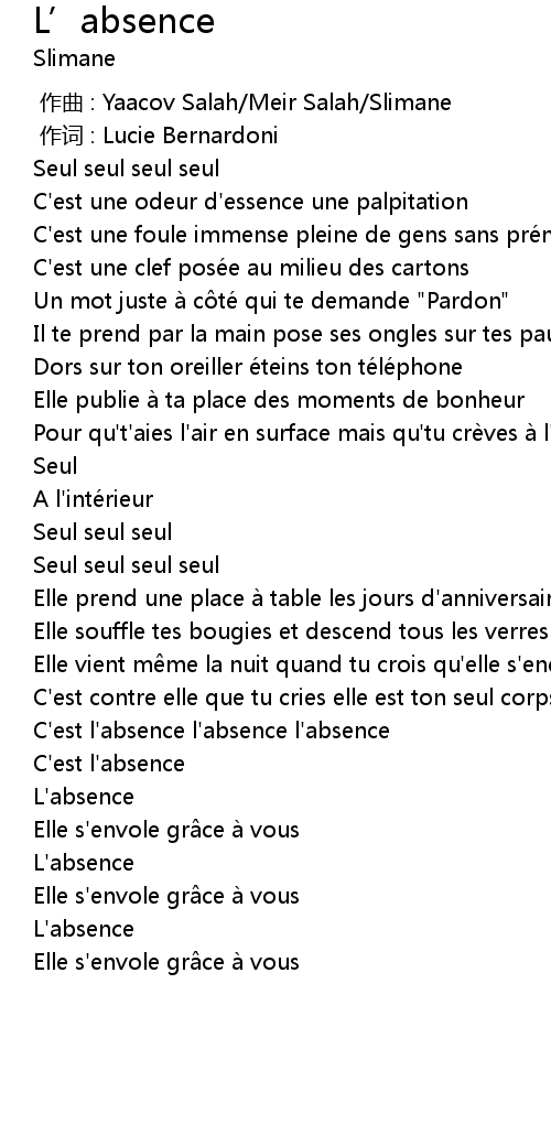 | [01:26.74] | C' est l' absence l' absence l' absence |