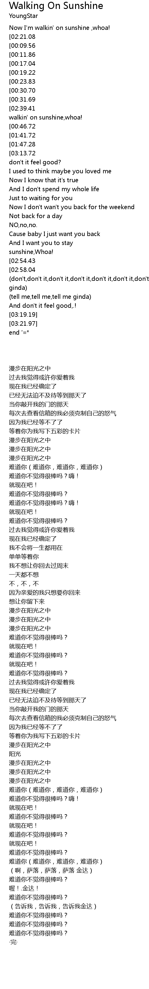 | [00:02.10] | Now I'm walkin' on sunshine ,whoa! |