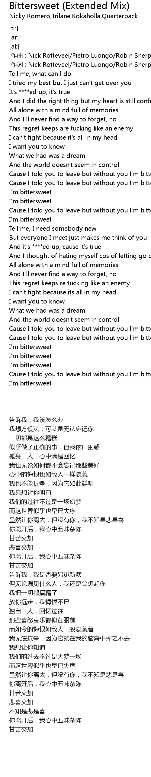 | [03:10.71] | Cause I told you to leave but without you I'm bittersweet |