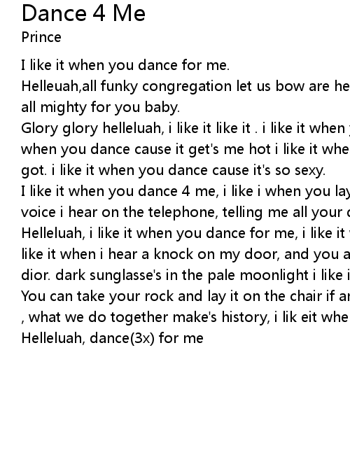Helleluah, i like it when you dance for me, i like it when you dance for me, i like it when i hear a knock on my door, and you are standin there with christian dior. dark sunglasse's in the pale moonlight i like it when the scene is right. |