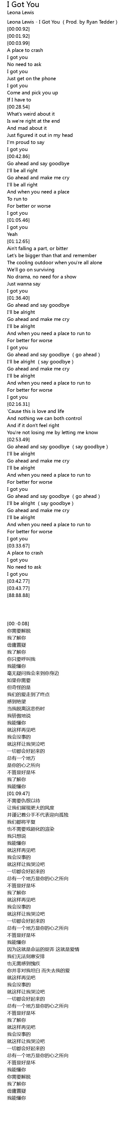 | [00:-0.08] | Leona Lewis I Got You Prod. by Ryan Tedder |