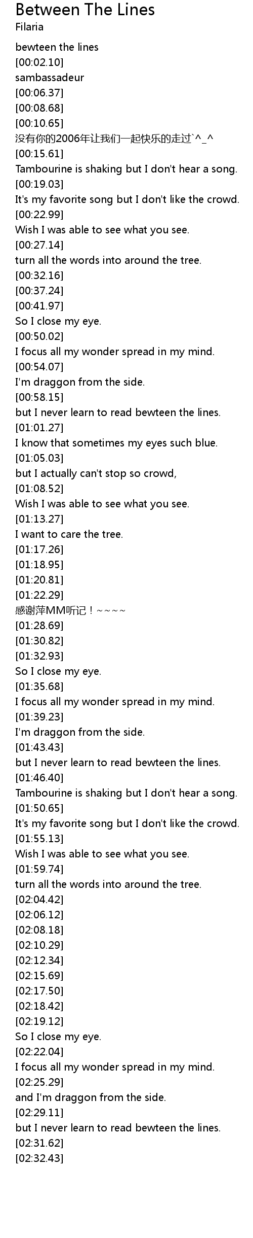 | [02:30.46] | but I never learn to read bewteen the lines. |