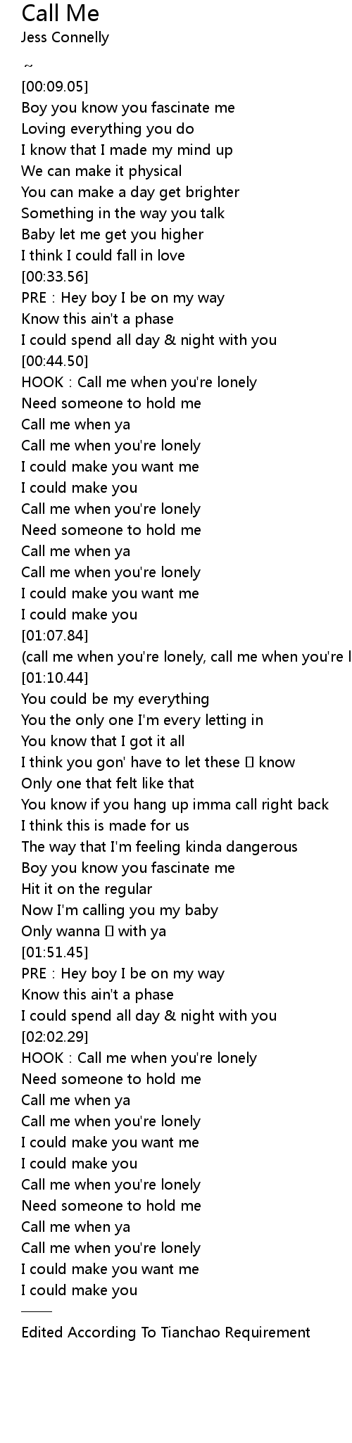 | [00:45.37] | HOOK: Call me when you' re lonely |