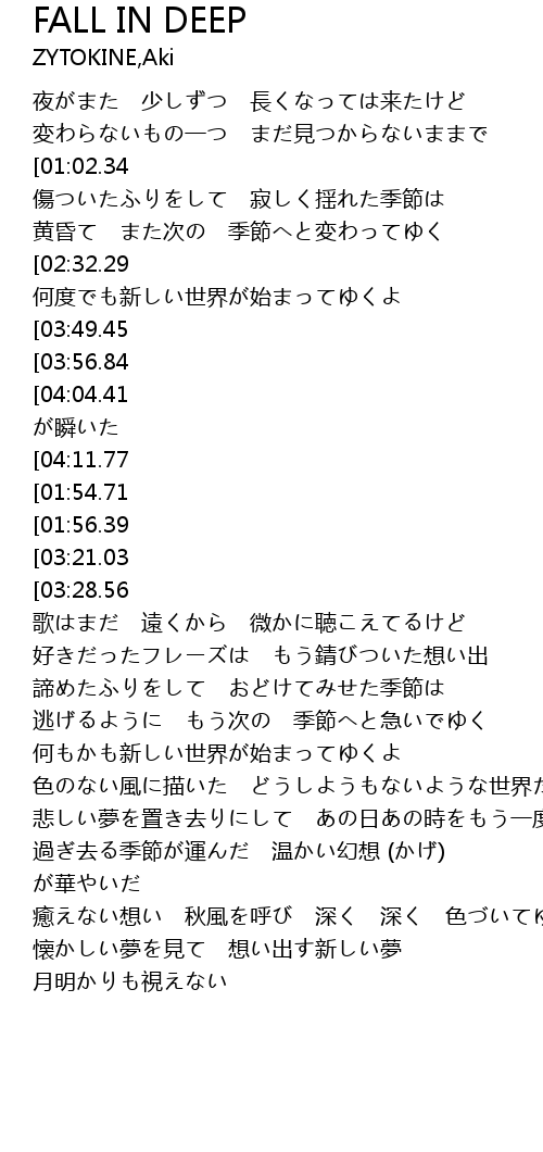 | [01:40.11][04:11.77] | 眩しい日々 秋風に舞い 深く 深く 色づいてゆく |