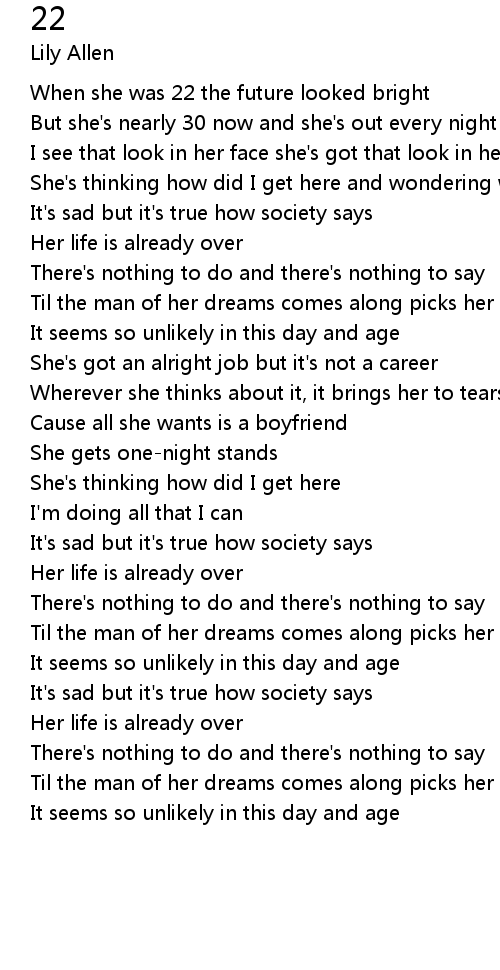 | [00:15.220] | But she' s nearly 30 now and she' s out every night |