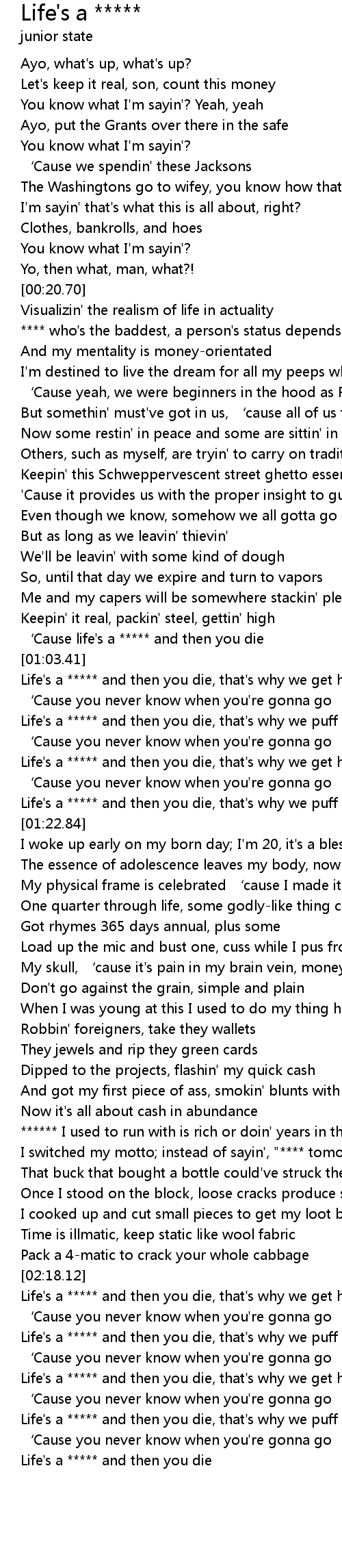 | [01:09.16] | Life's a ***** and then you die, that's why we puff lye |