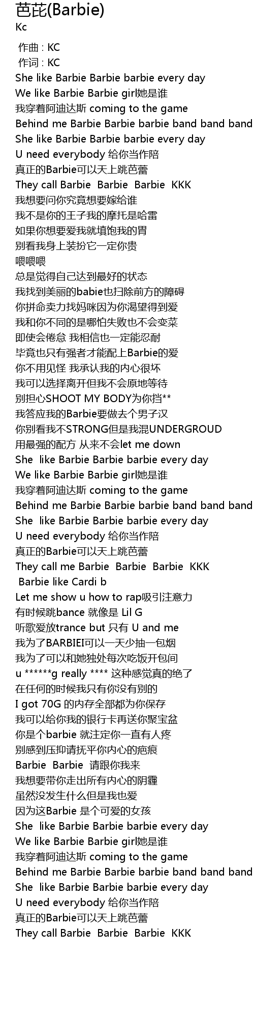 | [02:51.17] | They call Barbie Barbie Barbie KKK |