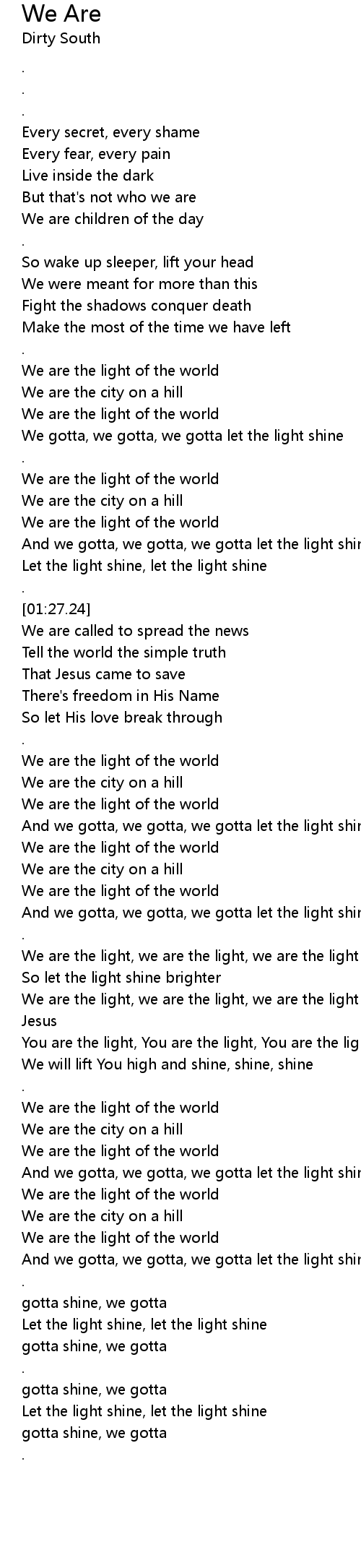 And we gotta, we gotta, we gotta let the light shine |