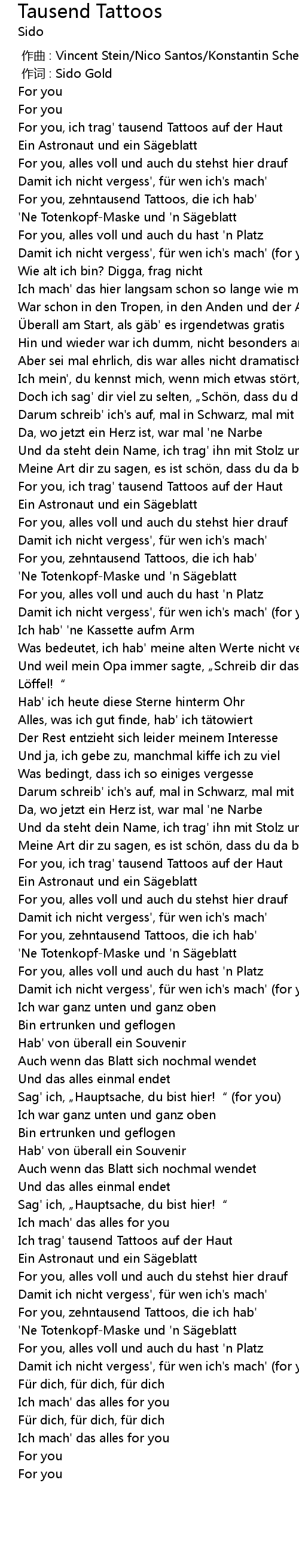 | [02:48.18] | For you, zehntausend Tattoos, die ich hab' |