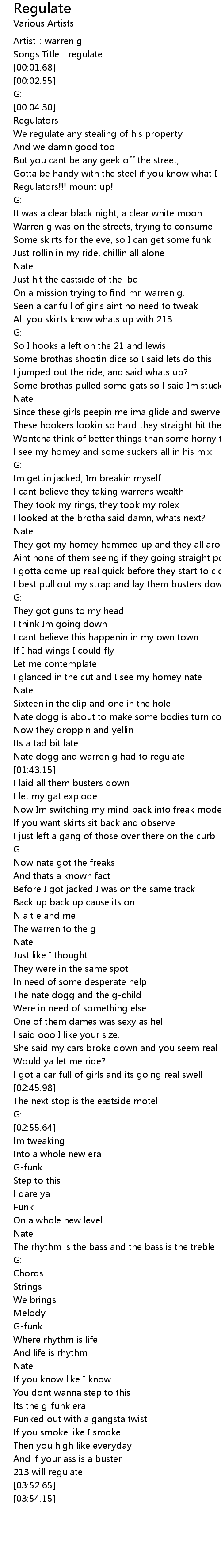 | [01:40.30] | Nate dogg and warren g had to regulate |