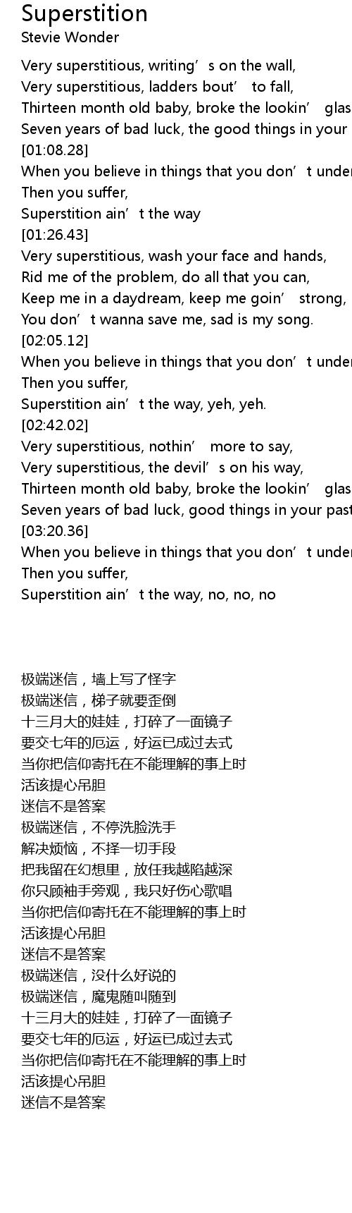 | [02:13.31] | Superstition ain' t the way, yeh, yeh. |