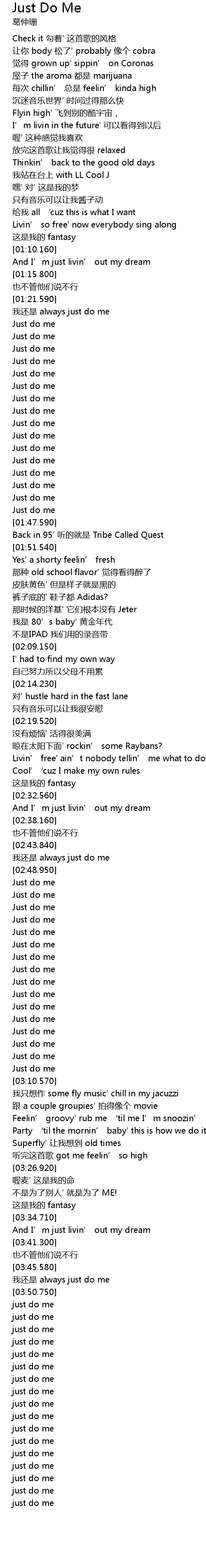 | [03:11.400] | wǒ zhǐ xiǎng zuò some fly music' chill in my jacuzzi |