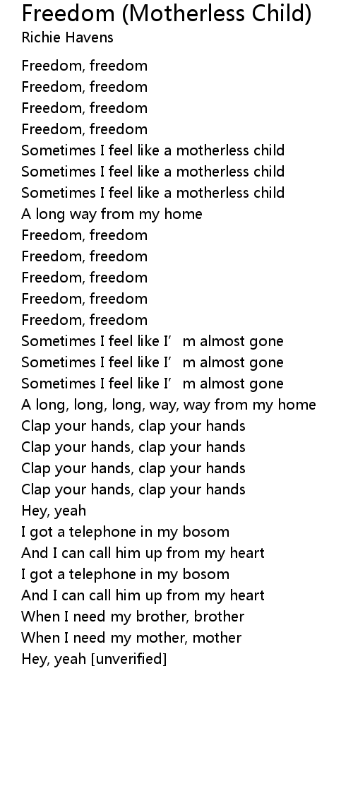 | Song | Freedom (Motherless Child) |