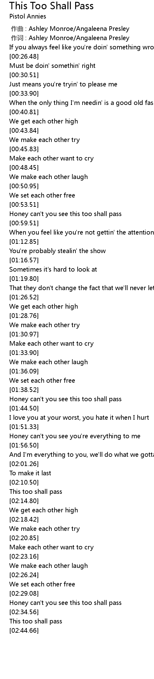 | [02:29.08] | Honey can' t you see this too shall pass |