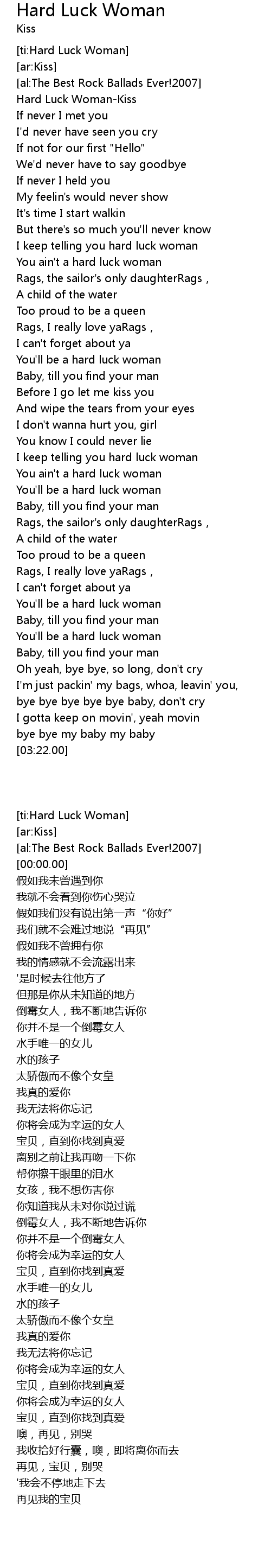 | [00:00.00] | Hard Luck WomanKiss |