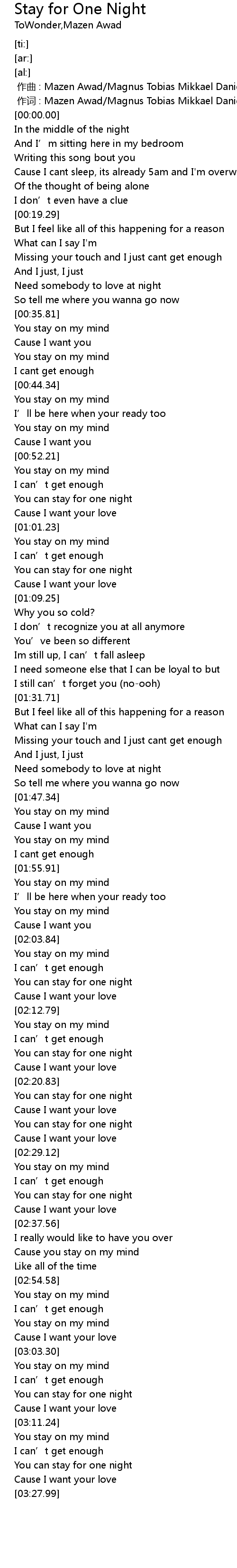 | [00:00.000] | 作词 : Mazen Awad/Magnus Tobias Mikkael Danielsson |