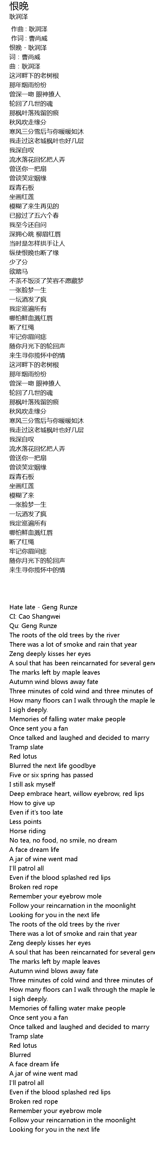 | [00:04.102] | 恨晚 - 耿润泽 |