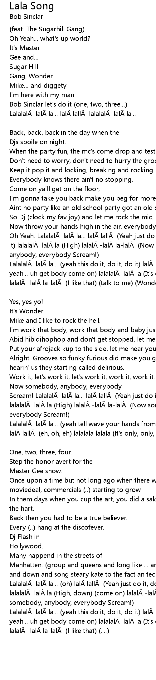 | Lalalalà lalà la... (yeah this do it, do it, do it) lalà lallà (Oh yeah... uh get body come on) lalalalà lalà la (It's only, only, only own) lalalà -lalà la-lalà (I like that) (....) |