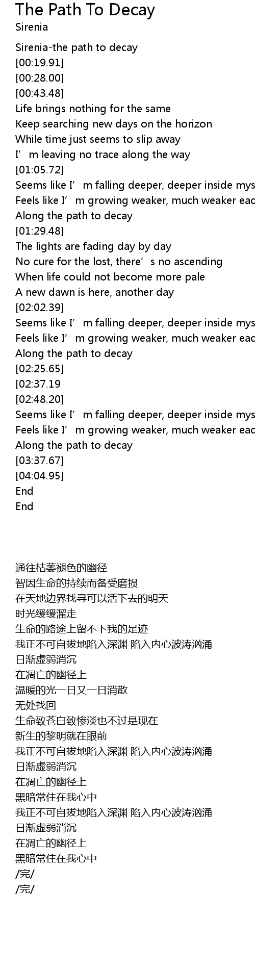 | [02:15.24] | Feels like I’m growing weaker, much weaker each day |