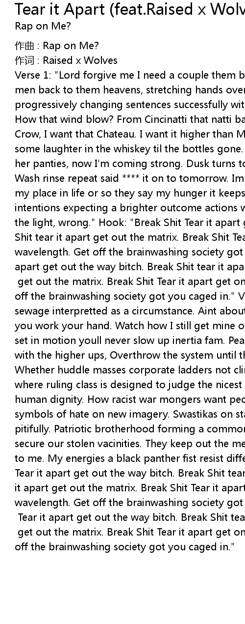 | Verse 1: "Lord forgive me I need a couple them blessings, for sending essence of men back to them heavens, stretching hands over weapons im teaching lessons, progressively changing sentences successfully within seconds. How should I know? How that wind blow? From Cincinatti that natti back to chicago. They call it Jim Crow, I want that Chateau. I want it higher than Mt Olympus Im tryna grow. Found some laughter in the whiskey til the bottles gone. Then fell in love, removed her panties, now I'm coming strong. Dusk turns to dawn Euphoria back to sorrow. Wash rinse repeat said **** it on to tomorrow. Im just a nigga competing to find my place in life or so they say my hunger it keeps me up at night. Bad intentions expecting a brighter outcome actions we comitted at night shine in the light, wrong." Hook: "Break Shit Tear it apart get out the way bitch. Break Shit tear it apart get out the matrix. Break Shit Tear it apart get on my wavelength. Get off the brainwashing society got you caged in.Break Shit Tear it apart get out the way bitch. Break Shit tear it apart | |