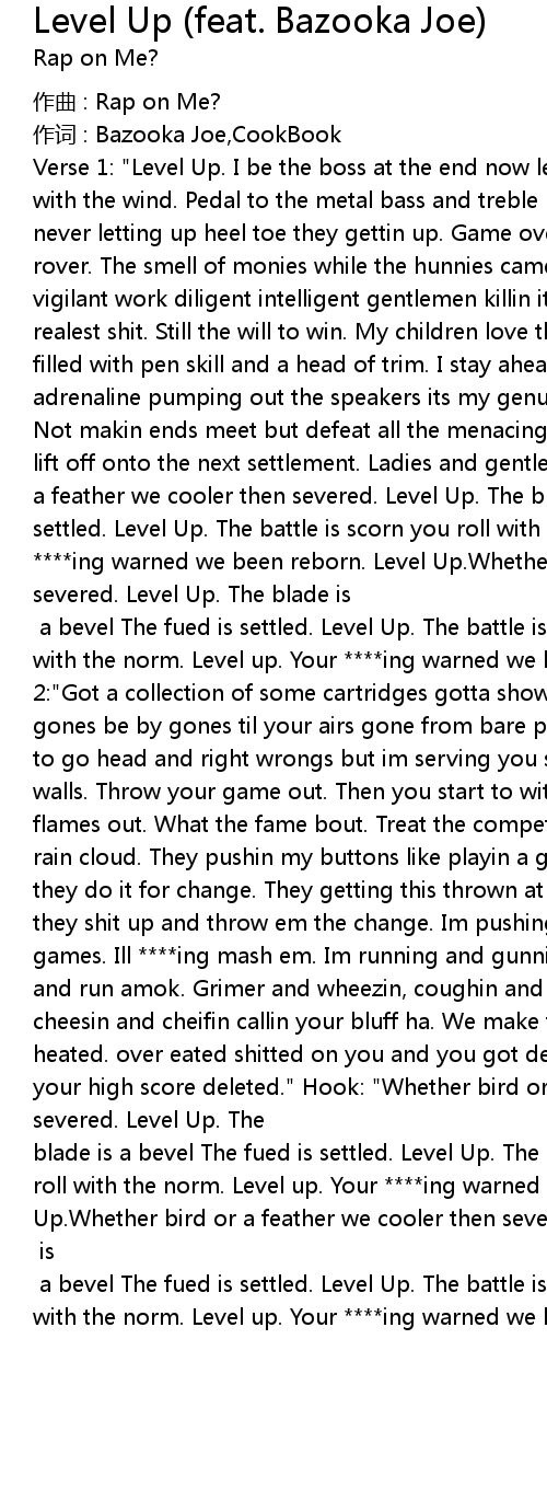 | with the norm. Level up. Your ****ing warned we been reborn. Level Up." Verse 2:"Got a collection of some cartridges gotta show my right to bear arms. Let by gones be by gones til your airs gone from bare palms. I can sit and write songs to go head and right wrongs but im serving you sentences crazy lock me in white walls. Throw your game out. Then you start to witness im a start to piss your flames out. What the fame bout. Treat the competition im a dog looking up at a rain cloud. They pushin my buttons like playin a game. They playin me out and they do it for change. They getting this thrown at em give em an enema ****ing they shit up and throw em the change. Im pushing your buttons like fighting in games. Ill ****ing mash em. Im running and gunnin em up. Offer and coughin venom and run amok. Grimer and wheezin, coughin and sneezin ya stuck now we akwardly cheesin and cheifin callin your bluff ha. We make the shit hot. like we over heated. over eated shitted on you and you got defeated. Level up type 609 and your high score deleted." Hook: "Whether bird or a feather we cooler then severed. Level Up. The | |