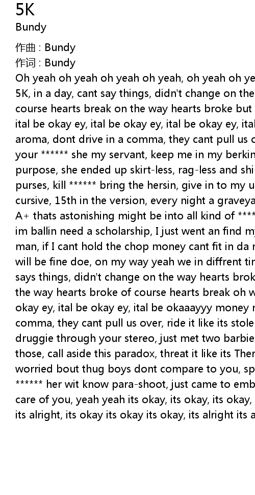 | 5K, in a day, cant say things, didn' t change on the way hearts broke but of course hearts break on the way hearts broke but of course hearts break oh wait ital be okay ey, ital be okay ey, ital be okay ey, ital be okaaayyy money my aroma, dont drive in a comma, they cant pull us over, ride it like its stolen, your she my servant, keep me in my berkin, she should of sing wit a purpose, she ended up skirtless, ragless and shirtless, use to just buy purses, kill bring the hersin, give in to my urges, went and got me all cursive, 15th in the version, every night a graveyard on 1st on 2nd 3rd shift, A thats astonishing might be into all kind of , sometimes I amaze myself im ballin need a scholarship, I just went an find myself wit it do the running man, if I cant hold the chop money cant fit in da rubber band, its okay doe, will be fine doe, on my way yeah we in diffrent times zones, 5K, in a day, cant says things, didn' t change on the way hearts broke but of course hearts break on the way hearts broke of course hearts break oh wait ital be okay ey, ital be okay ey, ital be okay ey, ital be okaaayyy money my aroma, dont drive in a comma, they cant pull us over, ride it like its stolen That known junkie talking druggie through your stereo, just met two barbies know im g on a pair of those, call aside this paradox, threat it like its Theraflu, Bundy what you worried bout thug boys dont compare to you, spend a grand on a pair of shoes, her wit know parashoot, just came to embarrass you, sent her home take care of you, yeah yeah its okay, its okay, its okay, its alright, its alright, its alright, its okay its okay its okay, its alright its alright its alright. |