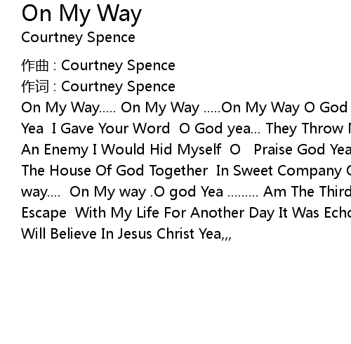| On My Way..... On My Way ..... On My Way O God .. Yea O God Yea Praise God Now Yea I Gave Your Word O God yea... They Throw Me Out I Am The Church If It Was An Enemy I Would Hid Myself O Praise God Yea But It was An Equal We God To The House Of God Together In Sweet Company O God i Say .... On My Way.... On My way.... On My way . O god Yea ......... Am The Third To Rise And Get Away... Escape With My Life For Another Day It Was Echoed Don' t Let him get Away Others Will Believe In Jesus Christ Yea,,, |