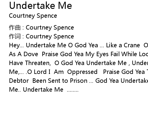 | Hey... Undertake Me O God Yea ... Like a Crane Or A Swollow O God Yea I Mourn As A Dove Praise God Yea My Eyes Fail While Looking Upwards To Heaven Yea I Have Threaten, O God Yea Undertake Me , Undertake Me O God Yea , Undertake Me,... .O Lord I Am Oppressed Praise God Yea Take My Side O Lord Is Like A Debtor Been Sent to Prison ... God Yea Undertake Me , Praise God Yea Undertake Me.. Undertake Me ........ |